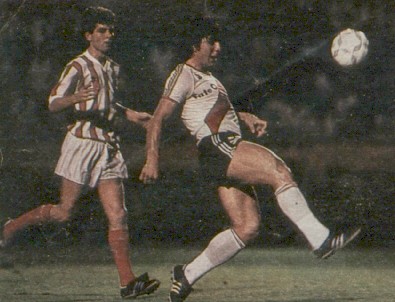 De gira por Estados Unidos, el River de Timoteo Griguol jugó dos partidos amistosos ante el Olimpiakos de Grecia, en agosto de 1987. El primero, disputado en Fort Lauderdale, terminó con victoria del Millonario por 3 a 1. El segundo, en el Memorial Stadium Mount Vermont de Nueva York, culminó con otra victoria argentina por 2 a 0, con goles de Ruggeri y Juan Gilberto Funes, que en la imagen define ante la marca de un defensor griego.