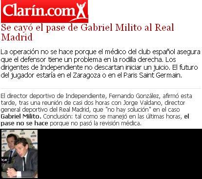 Después de ganar el título con Independiente el Gaby fue adquirido por el conjunto merengue. Sin embargo la revisación médica salió mal y por eso se truncó. Valdano y Butragueño con mucha verguenza debieron salir a respaldar al cuerpo médico. Señalaron que era un riesgo comprar su pase pues habían quedado vestigios de la lesión que había sufrido tiempo atrás. Gabriel pasó al Zaragoza y no se rompió, sino que la rompió.