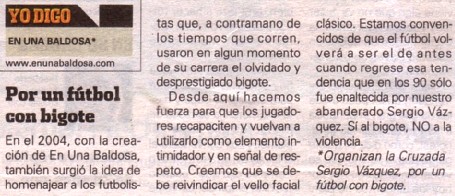 El Diario Deportivo Olé se sensibilizó con nuestra causa y publicó hoy en su página número 5 el enunciado de la Cruzada Sergio Vázquez. El texto que planta bandera sobre nuestros ideales más intrínsecos decora, además, una nota titulada «De bigotes y bigotitos«, que repasa en imágenes y palabras la historia de los jugadores con mostacho que alguna vez vistieron la camiseta de Boca Juniors.