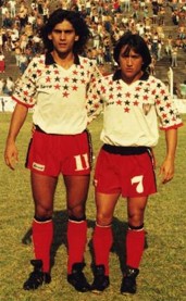 Los hinchas de Chacarita estuvieron de parabienes en la temporada 1990/91. No sólo vieron al bigotón Sicher despilfarrar sus últimos cartuchos sino que además fueron testigos de la utilización de una de las casacas más horripilantes que se hayan visto por San Martín. El diseño, a cargo de la firma Taiyo, imitaba a otros modelos de la época que parecían obsesionados por la astronomía y agregaban estrellas donde había un hueco. Como si fuera poco, el conjunto se completaba con pantalones y medias rojas. En la foto, lucen el atuendo los futbolistas Revuelta y Lugo.