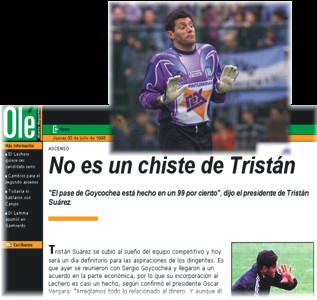 Oscar Vergara, Presidente de Tristán Suárez en 1998, pretendió darle un golpe de efecto a su amado club de la Primera B y para ello movió un par de piezas con nombre propio. No sólo contrató a Ricardo Bochini como DT (duró muy poco) sino que además, en julio de ese año, fue a la carga por un arquero de experiencia, el Vasco Javier Goycochea (un año antes habían intentado convencer al Pato Fillol). La negociación estuvo cerca de concretarse y de hecho el Diario Olé publicó una entrevista al dirigente, donde se daba por sentada la firma del contrato, condicionada por un par de cuestiones menores. «Arreglamos todo lo relacionado al dinero. Y aunque él puso como condición que formemos un equipo con aspiraciones al título, su llegada está acordada en un 99 por ciento«, declaró Vergara.