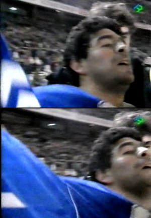 No se nota en lo absoluto cualquier distintivo que demuestre que la camiseta de Maradona es del madrid. Para mi que no lo es.