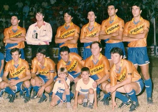 La foto habla por sí sola. La casaca era una baliza dentro de la cancha. Lo curioso es que, en la temporada 1989/90, la camiseta titular de Gimnasia y Esgrima de Concepción del Uruguay era mucho más que sobria: apenas blanca con detalles menores en azul.