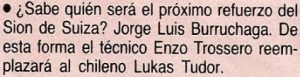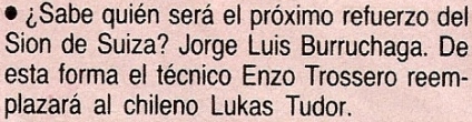 El Gráfico no se puso colorado a la hora de mandar una bomba que nunca estalló: allá por abril de 1991 confirmaba que Jorge Burruchaga iría a jugar al Sion de Suiza, para ocupar la vacante que dejaba Lukas Tudor. En pocas pero contundentes palabras, sostenía que un consagrado en México ‘86 que hacía un año había jugado otra final del mundo, iría a un fútbol de nivel intrascendente para ocupar el espacio de una promesa que nunca explotó y se volvía de Europa con más pena que gloria. Finalmente, el pase nunca se hizo, y en cambio llegaron al equipo suizo, que era entrenado por Enzo Trossero, otros dos argentinos para reforzarse en esa temporada: Juan Barbas y Gabriel Calderón.
