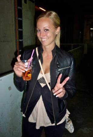 otra linda alemanita, rubia, bonita de cara, buenas tetas, flaca y altas piernas. en lo que respecte al vasito que lleva, es obvio que se esta tomando un cuba libre o un long island en el boliche; eso, o le cabe el peeing (?!).