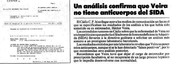 Finalmente, la dirigencia del Cádiz le encargó a dos laboratorios analizar la sangre de Veira y publicó los resultados en los periódicos AS, Marca y Mundo Deportivo: El Bambino no tenía SIDA. Tenía, eso sí, una causa abierta en la Argentina por abusar sexualmente de un menor, pero tampoco la pavada (?).