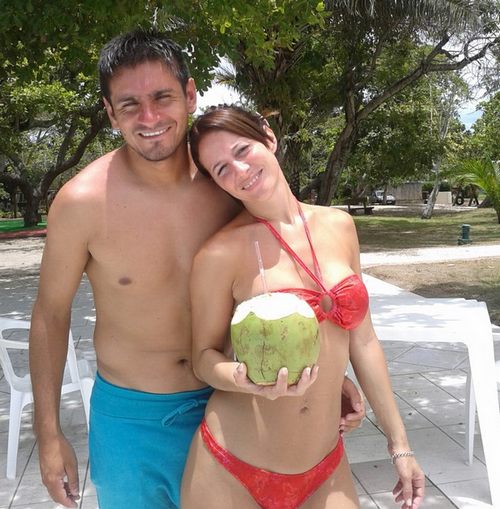 Buena medida de lolas, a pesar del corpiño de la bikini. Es un modelo que no ayuda a lucirlas. Queda mejos con el corpiño triangulo. Lo deja evidenciado el bulto que se adivina en el short de el al apoyarla.