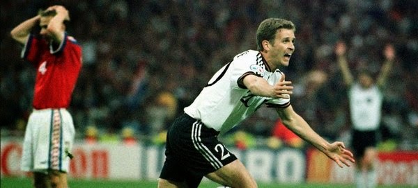 Me acuerdo que cuando Oliver Bierhoff marcó el 2 a 1 y sentenció el partido, muchos jugadores alemanes se ubicaron otra vez en sus posiciones o se quedaron quietos. Parece que algunos no estaban al tanto de la regla del gol de oro y no se habían enterado que eran los campeones. Que equipazo tenía Alemania!!