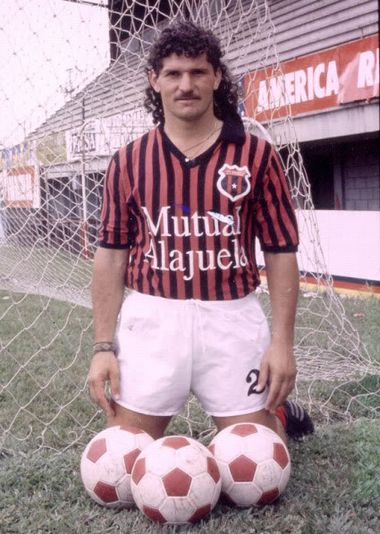 1. el corte de pelo rulos colectiveros mas bigote, simbolo de fines de los 80s y comienzos de los 90s en nuestros paises tropicales. si no me equivoco, la casaca es de la liga deportiva alajuelense, la famosa lda que juega el clasico costarricense contra el deportivo saprissa.