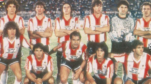 La imagen corresponde al partido de vuelta de la semifinal de la Supercopa 1990, cuando Estudiantes cayó por penales frente a Nacional, en Montevideo. Completan la formación: Peinado, Craviotto, Iribarren, Prátola, Merlo, Erbín (arriba); Commisso, Centurión y Trotta (abajo, entre los mencionados Aredes y Mac Allister).