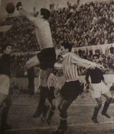La Academia anduvo de gira por tierras europeas a principios de 1954, iniciando la misma en Italia: el primer encuentro de esa maratón de viajes y partidos fue en Italia, frente a la Roma. El trámite del mismo resultó bastante deslucido, con pocas acciones de gol, concluyendo en un empate sin goles. En la imagen, el arquero Moro despeja con golpe de puños cuando entraba Pizzuti, en uno de los contados ataques de Racing.