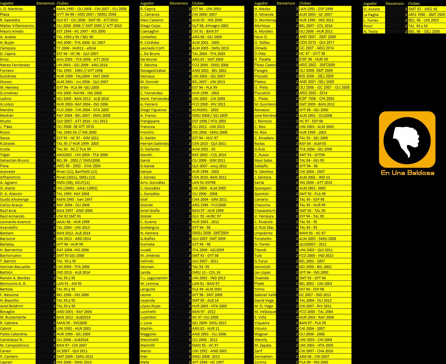Para que se sigan deleitando, acá el listado (trabajo de @JoloFutbol) de jugadores con 2 o más descensos: