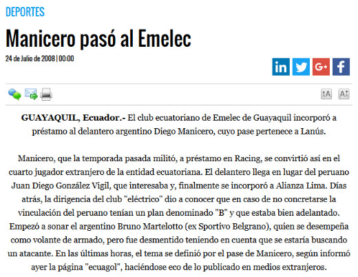 De nuevo en Lanús, también se le cerraron las puertas. Así surgió la posibilidad de incorporarse al Emelec de Ecuador, que venía a los tumbos en el campeonato local y necesitaba un goleador. Caída la chance del peruano Juan Diego Gonzales-Vigil, Manicero tenía todos los números y hasta llegó a ser anunciado por la prensa.