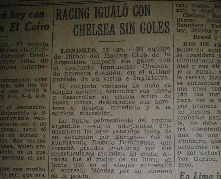 Durante los primeros meses de 1954, Racing llevó a cabo una intensa gira por varios países europeos. Tras haber terminado el último campeonato argentino en el tercer puesto, disputó juegos en Italia, Yugoslavia, España y Bélgica, antes de llegar a Inglaterra, donde chocó ante el Wolverhampton y el Chelsea.