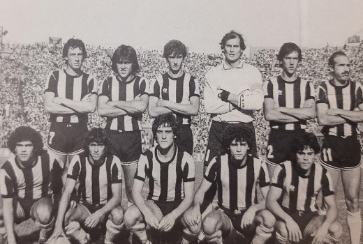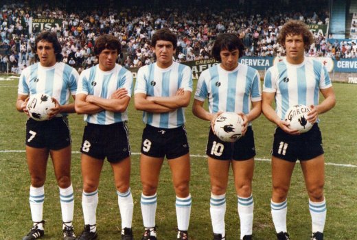 La imagen corresponde a la tarde del 26 de octubre de 1980. Aquel día, Racing venció a Vélez por 2 a 0, utilizando camisetas de una marca, pero pantalones de otra. La celeste y blanca, que lucen Scalise, Barbas, Albisbeascoechea, Carlos López y Calderón, había sido confeccionada por Sportlandia. Los shorts, estaban a cargo de Adidas.