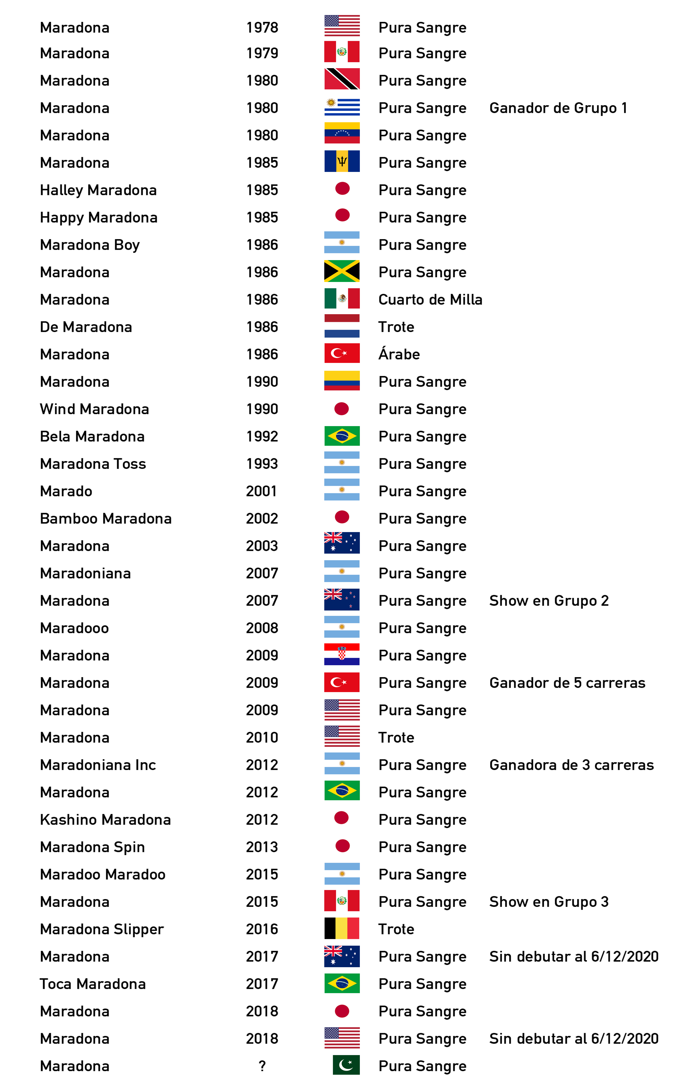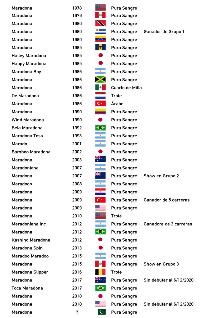 En total tenemos caballos de carrera (machos y hembras) llamados Maradona en: Argentina (7), Japón (7), Estados Unidos (4), Brasil (3), Perú (2), Australia (2), Turquía (2), Uruguay, Colombia, Venezuela, México, Jamaica, Trinidad y Tobago, Barbados, Nueva Zelanda, Croacia, Bélgica, Holanda y Pakistán (1). Acá les dejamos la lista para que alguien de otro medio levante, haga una infografía con un mapamundi y quede como un crack.