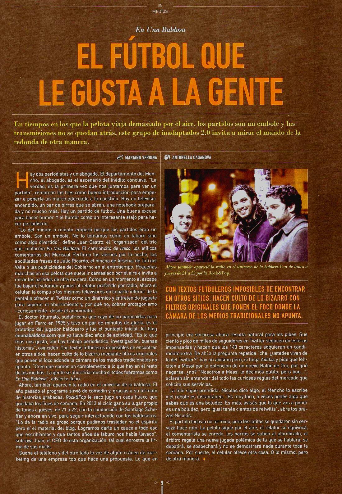 – La FIFA sorteó las entradas para el Mundial de Brasil, perjudicando bastante a los argentinos. Sólo tocaron 4493 para este amado país (?). La cuestión es que 5 de esas entradas fueron para el staff de En Una Baldosa, que enseguida pensó en revenderlas el privilegio de ver un partido de la Copa del Mundo, así fuese Bosnia – Irán. Después nos enteraríamos que los tickets eran para Holanda – Australia. Bastante bien.