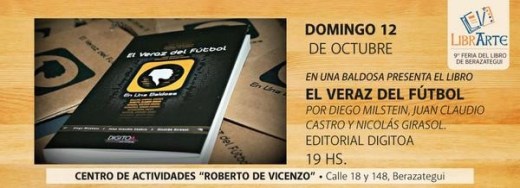La gira baldosera continúa. Este domingo 12 de octubre, a las 19 h, estaremos presentando El Veraz del Fútbol en LibrArte, la 9º Feria del Libro de Berazategui.