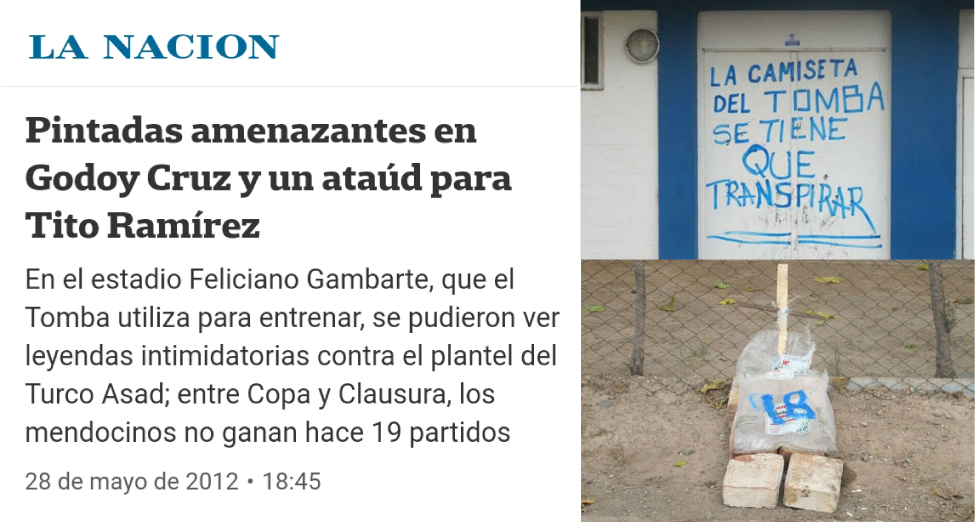 La frase cliché que recorría los medios locales era que «el goleador se queda a gusto en Mendoza, donde recibe un trato excelente de los hinchas»… Si hay algo que nos enseñan los malpases es que el cassette del autoconvencimiento (?) no siempre funciona bien. El bueno de Tito se quedó en Godoy Cruz a jugar la Libertadores, y se convirtió -luego de la eliminación en fase de grupos y la magra campaña en el torneo local- en el principal objetivo de amenazas perpetradas por el hampa tombino.