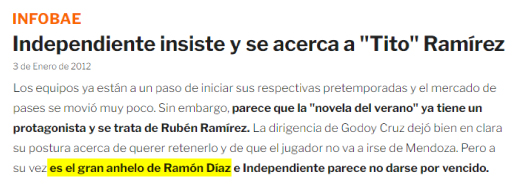 Finalizado el campeonato, fue Independiente -por expreso pedido del DT Ramón Díaz- el que apareció con serias intenciones de contratar a Tito, flamante goleador del Apertura 2011. «Sin plata para refuerzos» -según palabras del presidente Javier Cantero- las negociaciones avanzaron con el jugador, con quien llegaron a un acuerdo contractual. La idea fue que él mismo presione para que Godoy Cruz habilite su salida, ya que según gente que participó de las tratativas estaba claro que «Ramírez quiere jugar en el Rojo«. Del resto se ocuparía un grupo inversor que ofrecería dinero y un pack de jugadores de Independiente como intercambio.