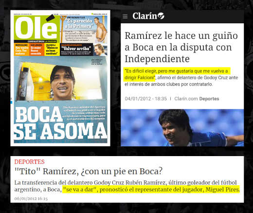 La novela comenzó en octubre de 2011, cuando la lesión de Lucas Viatri habilitó a Boca a buscarle un reemplazante. Rubén Ramírez, de gran desempeño en Godoy Cruz, apareció como el candidato más viable, por encima de figuras como las de Carlitos Tévez y Teo Gutiérrez. El DT Julio César Falcioni reconoció el interés: “Lo conozco de cuando lo dirigí en Colón y Banfield, y siempre me rindió”. Los 4 millones de dólares que habría pedido Godoy Cruz y el buen andar de Boca en el resto del torneo hicieron que El Emperador terminara conformándose con los pibes del club.