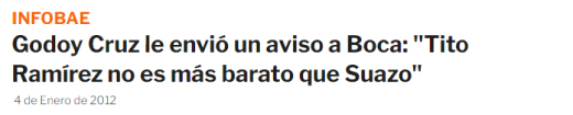 Con el mal de ojos a cuestas, el traspaso de Tito a Boca comenzaría a estancarse cuando le tocó entrar en la discusión a Godoy Cruz, club que negaba a desprenderse fácilmente del goleador… sobre todo en vísperas de la primera experiencia del Tomba en Copa Libertadores. Mario Contreras -mandamás del bodeguero– fue contundente: «A los dirigentes les gusta más hablar con representantes que con los presidentes de los clubes (…) No he tenido ningún diálogo con directivos de Boca e Independiente por Ramírez. Tenemos el 60% del pase y nadie llamó. El resto es del grupo empresario de Miguel Pires. Si nos llaman vamos a pedir mucho dinero por dejarlo ir (…) Ramírez no es más barato que Suazo».