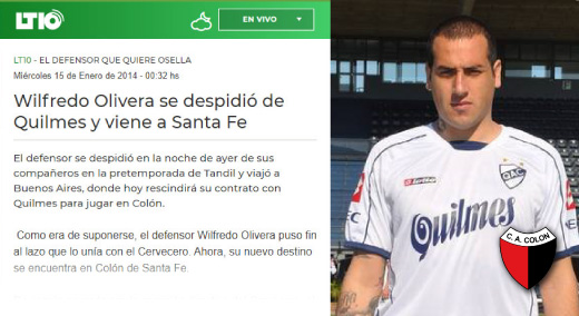 Caída la llegada del joven peruano, la CD fue a contratar al defensor elegido por el entrenador: Wilfredo Olivera, confeso hincha del sabalero que por entonces estaba marginado en Quilmes. “Osella me quiere ciegamente y voy a un club donde me eligieron a pesar de que hace 8 meses y medio que no juego… Voy a estar cerca de mi familia, pero más allá de todo priorizo jugar… Tengo en claro que vamos a pelear la permanencia con Quilmes, pero le deseo lo mejor. Ojalá los dos equipos podamos mantener la categoría y que se vaya otro. Habrá que sacar muchos puntos”.