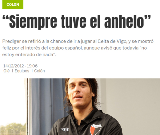 Pues entonces, para fines de 2012, la carrera internacional de Prediger parecía tener un reload (?). Alrededor del 10 de diciembre de ese año medios españoles y argentinos hicieron público el interés del Celta de Vigo por el mediocampista entrerriano. El club español estaba dispuesto a desembolsar entre 800.000 y 1.000.000 de euros por el 50% del pase (la otra mitad pertenecía al Porto), y un contrato por tres temporadas y media. ElPerro fue solicitado expresamente por el DT del Celta, Paco Herrera, para reforzar su equipo de cara a la segunda mitad de la Liga. Incluso el secretario técnico de la entidad gallega, Miguel Torrecilla, estuvo en Argentina un par de semanas atrás comprobando in situ las prestaciones del futbolista antes de dar el visto bueno a la operación. La cosa iba en serio (?).