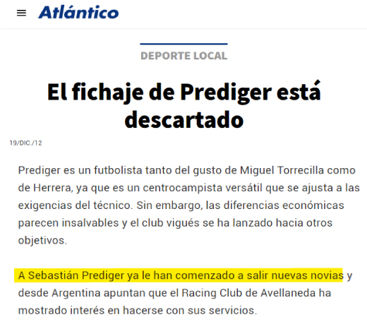 Los días transcurrieron sin más novedades, hasta que el 19 de diciembre, el periódico Atlántico de España publicó «El fichaje de Prediger está descartado», expresando que las diferencias económicas fueron el detonante y que el club vigués saldría a buscar a otro jugador. Incluso, el medio español deslizó la posibilidad que el jugador argentino esté coqueteando (?) con otra mina Racing.