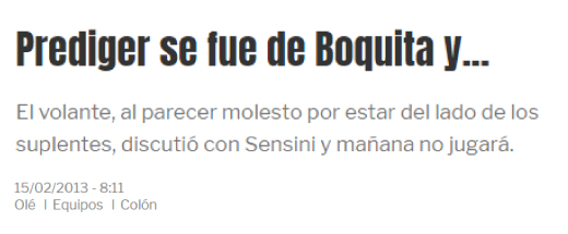 Ante la consulta por saber si el motivo fue alguna traba que puso el Porto o el pedido de más dinero por parte de Colón (en concepto del año y medio de contrato que le quedaba), Prediger tomó temperatura y apuntó a las altas esferas (?): «Eeeeh bueno, eso se lo podrían preguntar a quien le tienen que preguntar, yo puse la mejor predisposición. Ahora le tocará hablar a la gente que le toque hablar. Hay gente que está más arriba que debería dar explicaciones también«, refiriéndose quizás, al cúmulo de manos en el plato que quería sacar tajada de la transferencia y no se ponían de acuerdo.