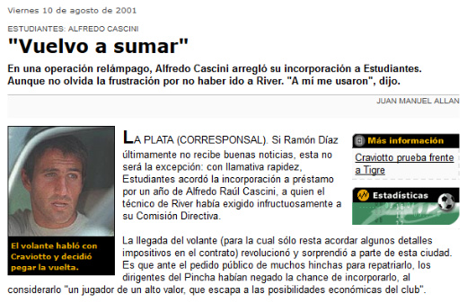Si bien el Millonario ya tenía varias alternativas para su posición en la mitad de la cancha (Leonardo Astrada, el Lobo Ledesma, Guillermo Pereyra y el Cuchu Cambiasso), Cascini se veía con chances y hasta se animaba a chicanear al eterno rival: «Contra Boca me fue bien. Con Estudiantes le gané las dos veces que jugamos y con Independiente le ganamos bastante. No sé si lo tengo de hijo, pero hay algo especial; me gusta mucho jugar contra Boca».