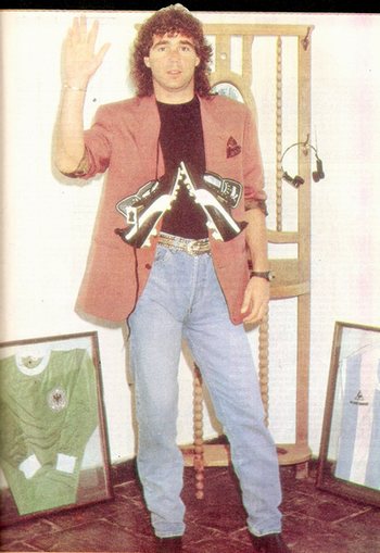 Al margen de que el encargado de recortar las fotos en la revista Súper Fútbol tenía un Parkinson de la concha de la lora (?), la imagen alcanza a mostrar un fragmento de la buena vida que llevaba Leo Rodríguez a comienzos de los 90’s, cuando los billetes le sobraban para comprar autos de lujo y…vinchas último modelo. Para completar, campera de baseball, jean, zapatillas deportivas y manos en los bolsillos. Un canchero de los que no quedan.
