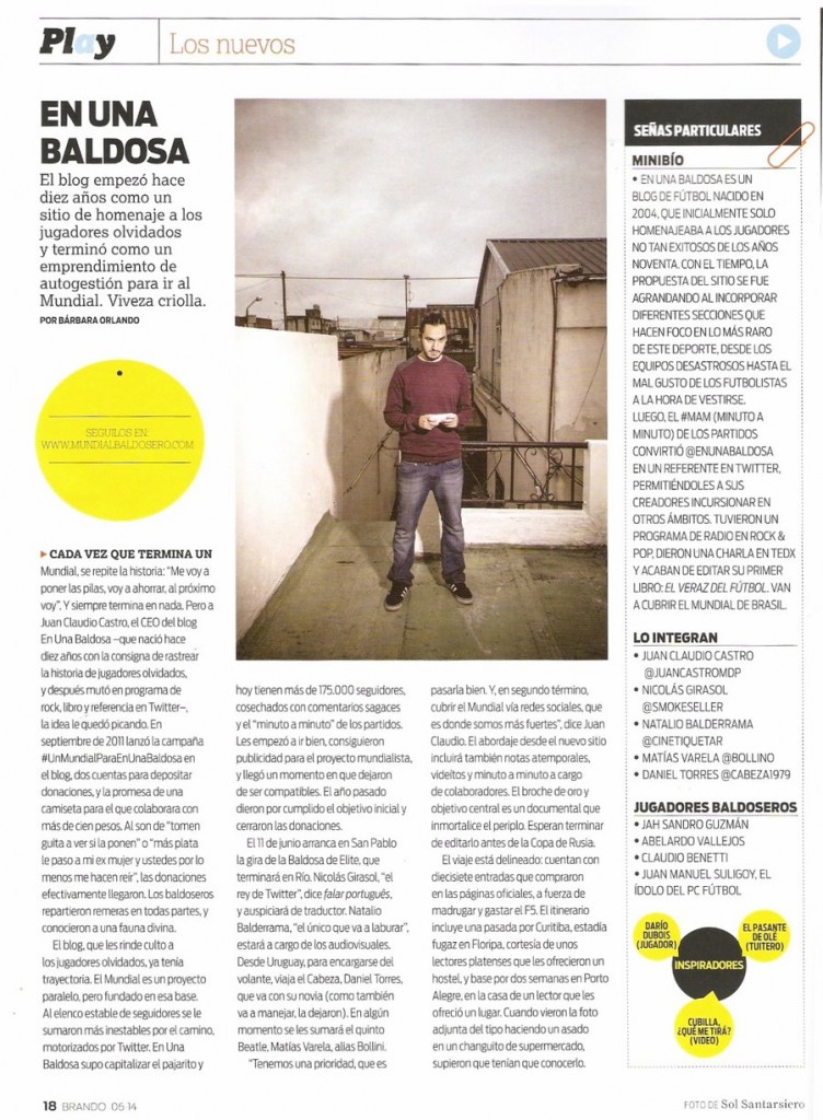 La revista Brando nos entrevistó para su edición de junio. Hablamos sobre el proyecto #UnMundialparaEnUnaBaldosa y, según la periodista, supimos «capitalizar el pajarito». Para verla completa, click acá.