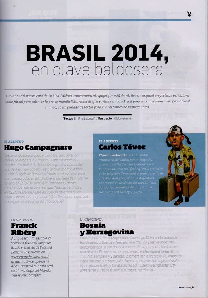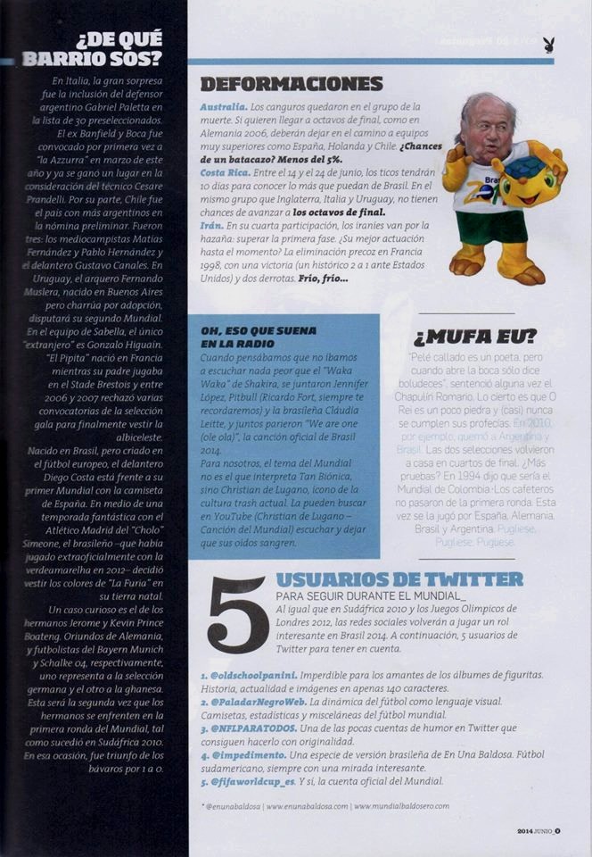 – La revista Playboy nos dedicó un buen espacio en su edición de junio. Ahí pudimos adelantar el Mundial con nuestro estilo, basándonos en nuestras secciones y demostrando nuestros conocimientos, especialmente con el pronóstico de Costa Rica (?). Además, la nota fue ilustrada por Domenech, un lujo. Para leerla completa, hagan click acá, acá y acá. Y después vayan al oculista (?). Las minas se las debemos.