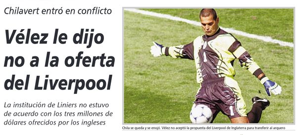El Liverpool de Inglaterra ofreció 3 millones de dólares limpios por el arquero paraguayo, pero el club de Liniers pretendía 4. «Estoy muy desilusionado. Yo había hablado en Francia con algunos empresarios del Liverpool y hoy estuvieron reunidos con los dirigentes de Vélez haciendo una oferta millonaria. Pero la rechazaron. Yo no sé qué tienen en la cabeza.», decía Chila, que al día siguiente no fue a entrenar. ¿Caliente? Naaah.